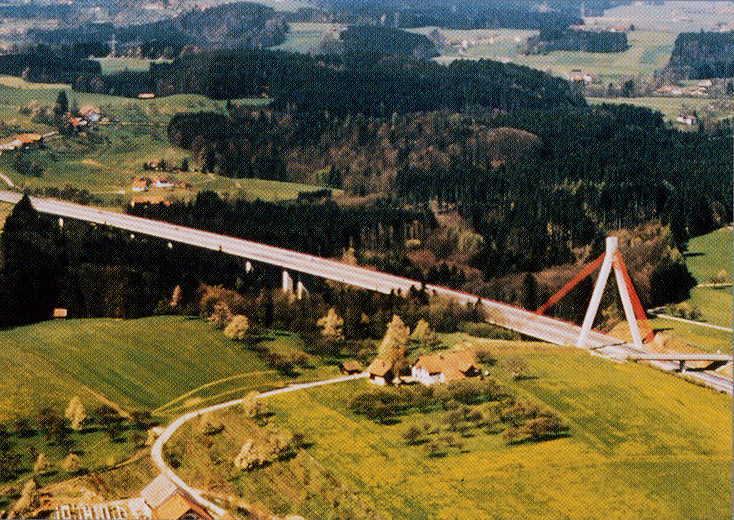 (BAB Ulm-Bregenz, ca. 8 km südlich von Wangen/Allgäu, 9°44'45"O 47°38'30"N) Montage eines abnehmbaren Geländers sowie andere Arbeiten auf dem Kopf des Pylons - über rollendem Verkehr! Projektleitung und Montageleitung 27.-30.07.98 (als Angestellter der Fa. Heuser + Vlasic) |